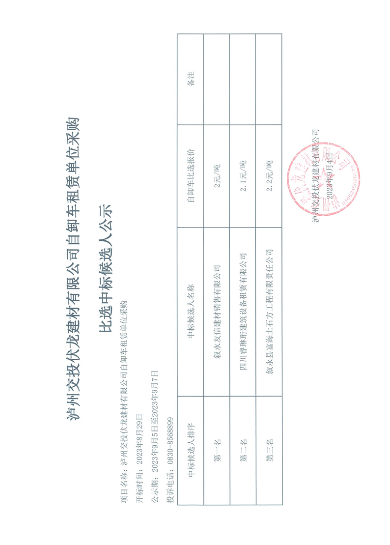 瀘州交投伏龍建材有限公司自卸車租賃采購比選中標候選人公示