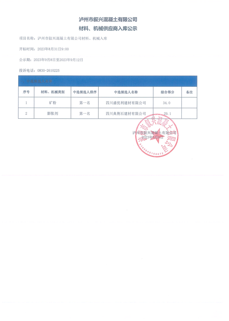瀘州市敘興混凝土有限公司材料、機(jī)械供應(yīng)商入庫公示