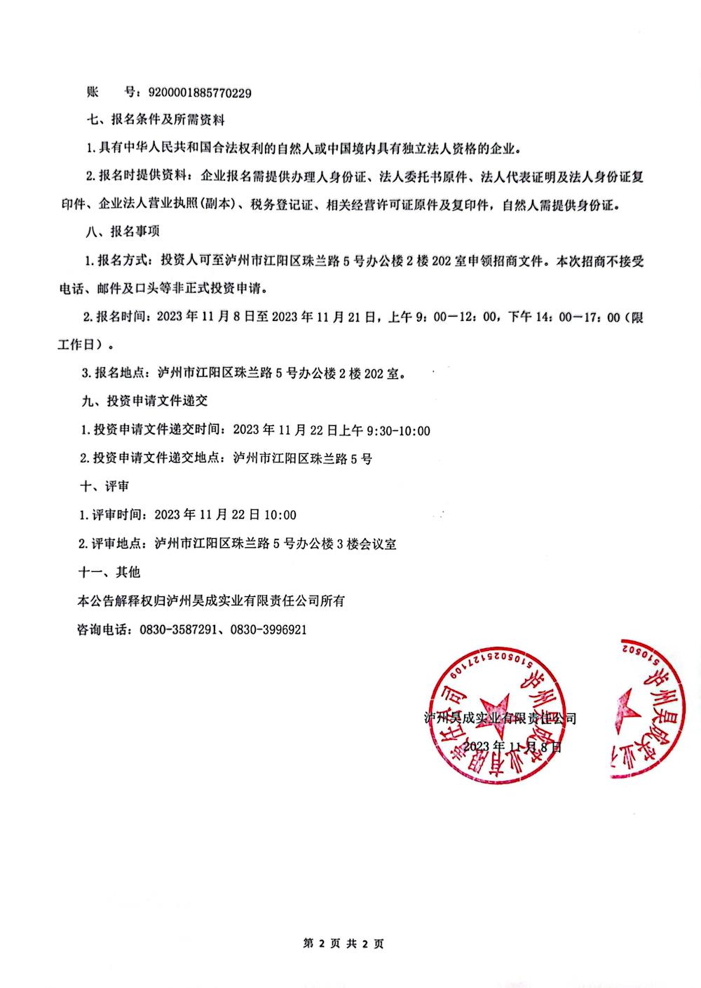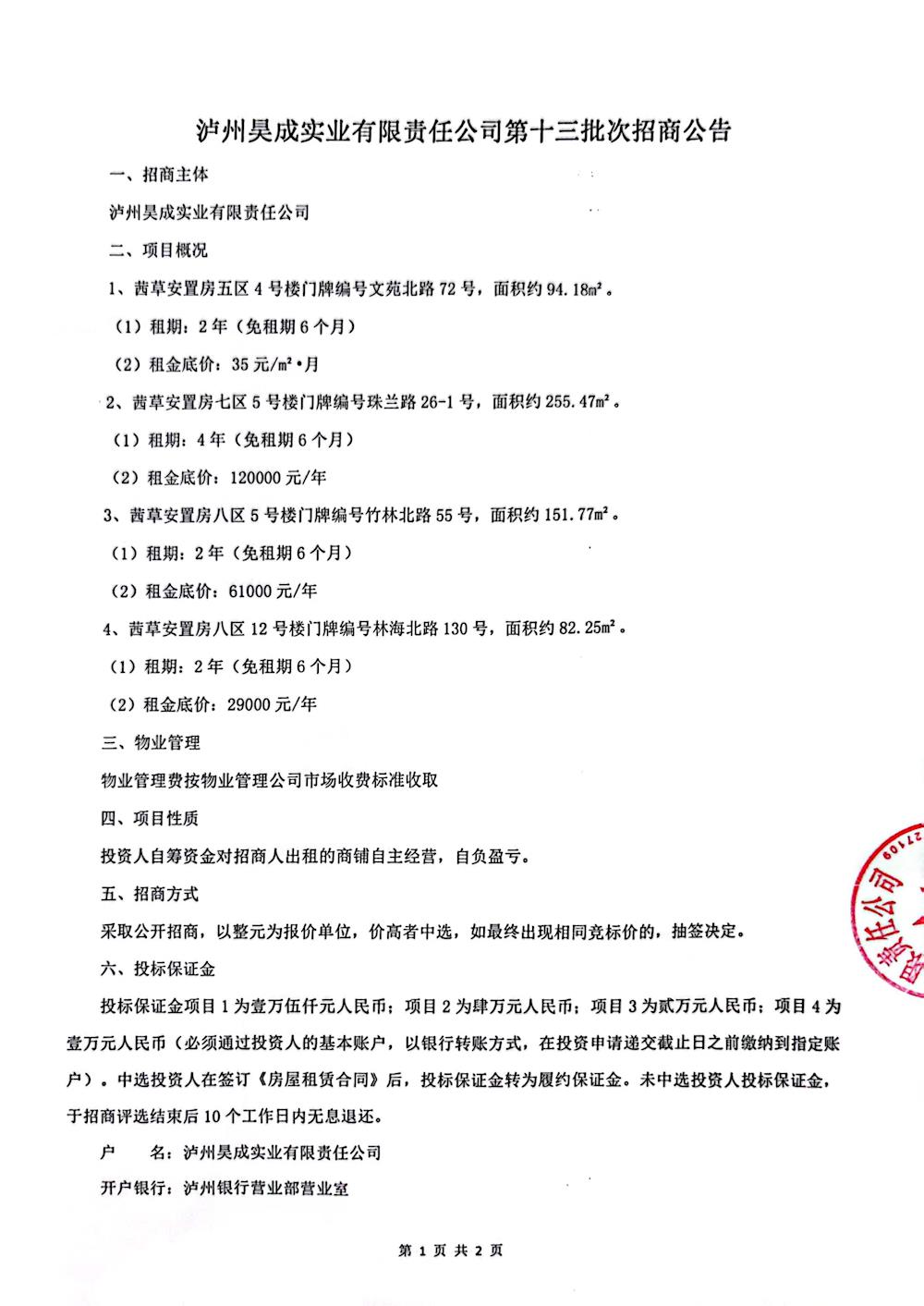 瀘州昊成實(shí)業(yè)有限責(zé)任公司第十三批次招商公告