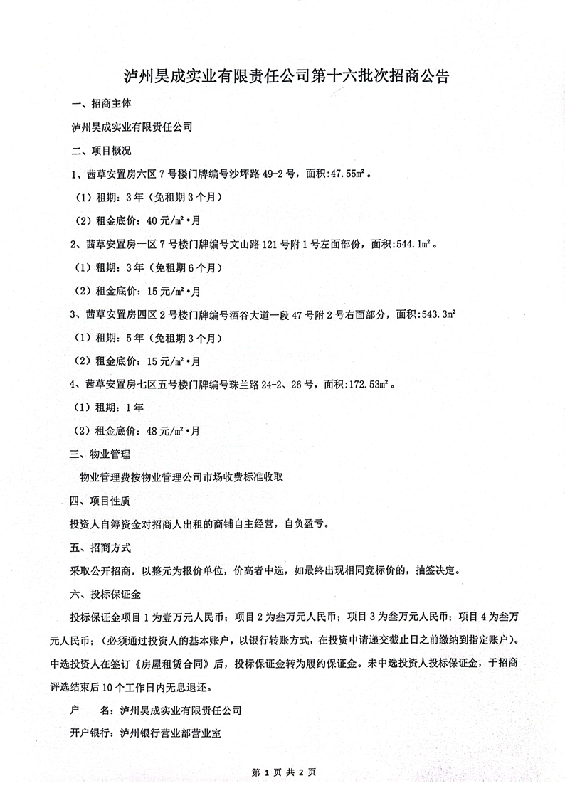 瀘州昊成實(shí)業(yè)有限責(zé)任公司第十六批次招商公告