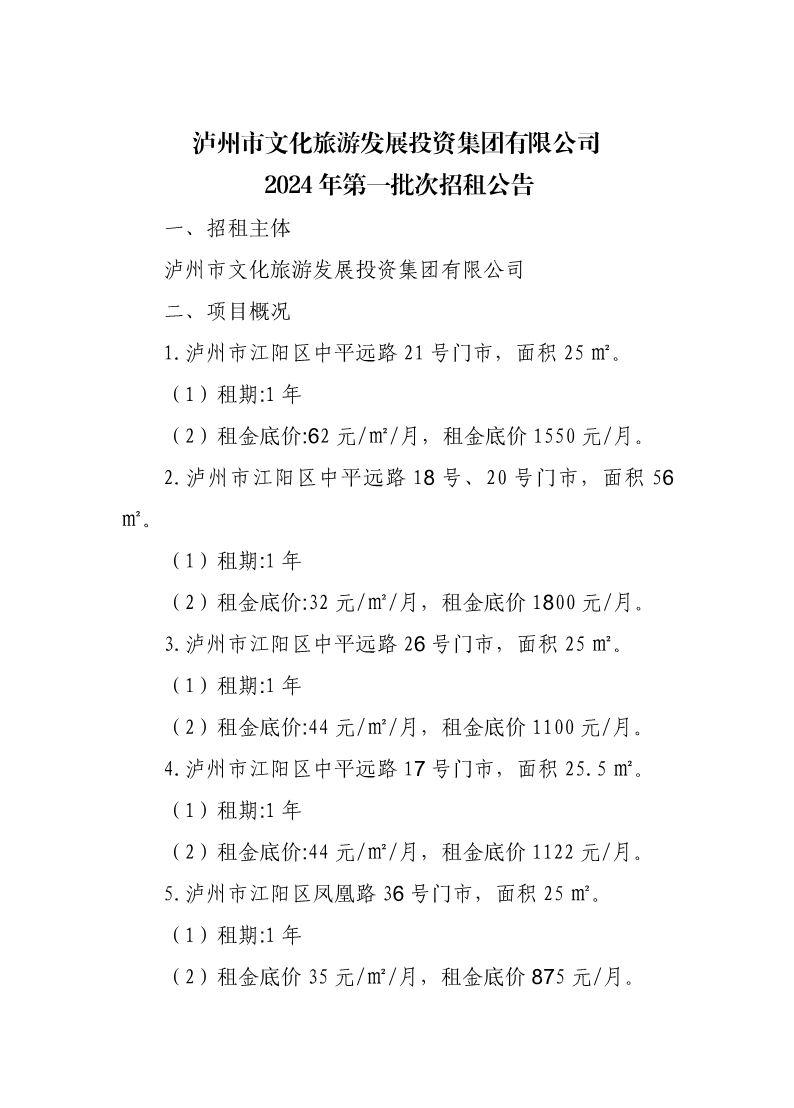 瀘州市文化旅游發(fā)展投資集團有限公司2024年第一批次招租公告