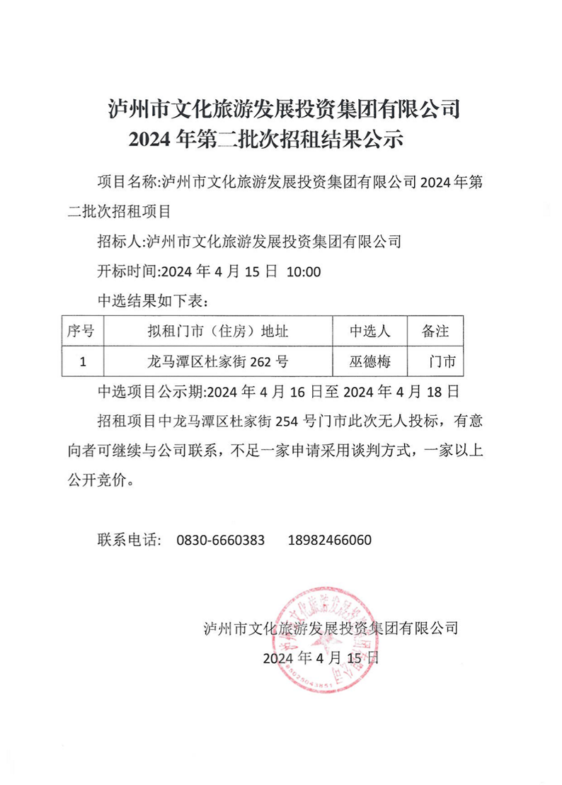 瀘州市文化旅游發(fā)展投資集團(tuán)有限公司2024年第二批次招租結(jié)果公示 作者: 來(lái)源: 日期:2024-04-15 瀏覽次數(shù): 次 【字體:小 大】 【打印正文】