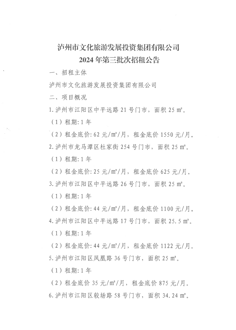 瀘州市文化旅游發(fā)展投資集團有限公司2024年第三批次招租公告