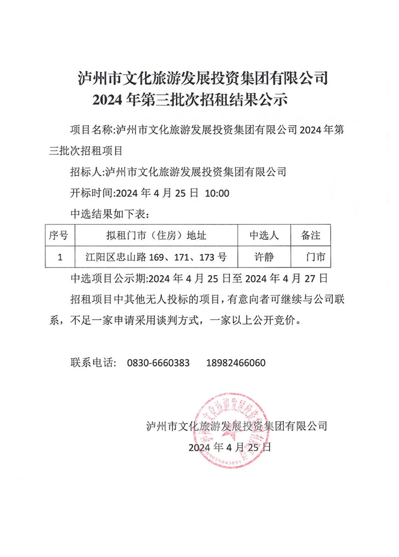 瀘州市文化旅游發(fā)展投資集團有限公司2024年第三批次招租結(jié)果公示
