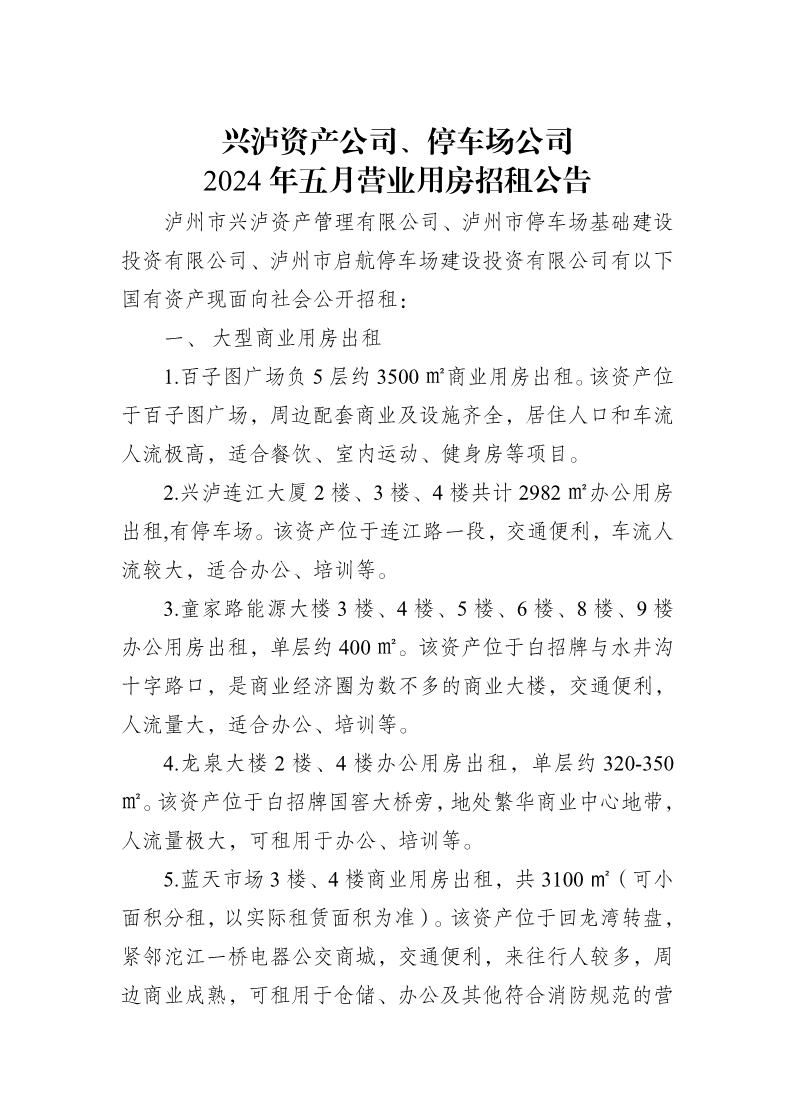 興瀘資產(chǎn)公司、停車場公司2024年五月營業(yè)用房招租公告