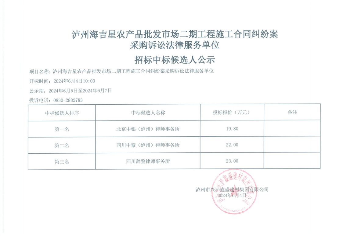 瀘州海吉星農(nóng)產(chǎn)品批發(fā)市場二期工程施工合同糾紛案采購訴訟法律服務單位招標中標候選人公示 作者: 來源: 日期:2024-06-04 瀏覽次數(shù): 次 【字體:小 大】 【打印正文】