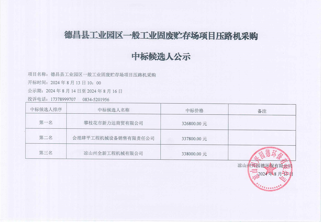 德昌縣工業(yè)園區(qū)一般工業(yè)固廢貯存場項(xiàng)目壓路機(jī)采購中標(biāo)候選人公示 作者: 來源: 日期:2024-08-13 瀏覽次數(shù): 次 【字體:小 大】 【打印正文】