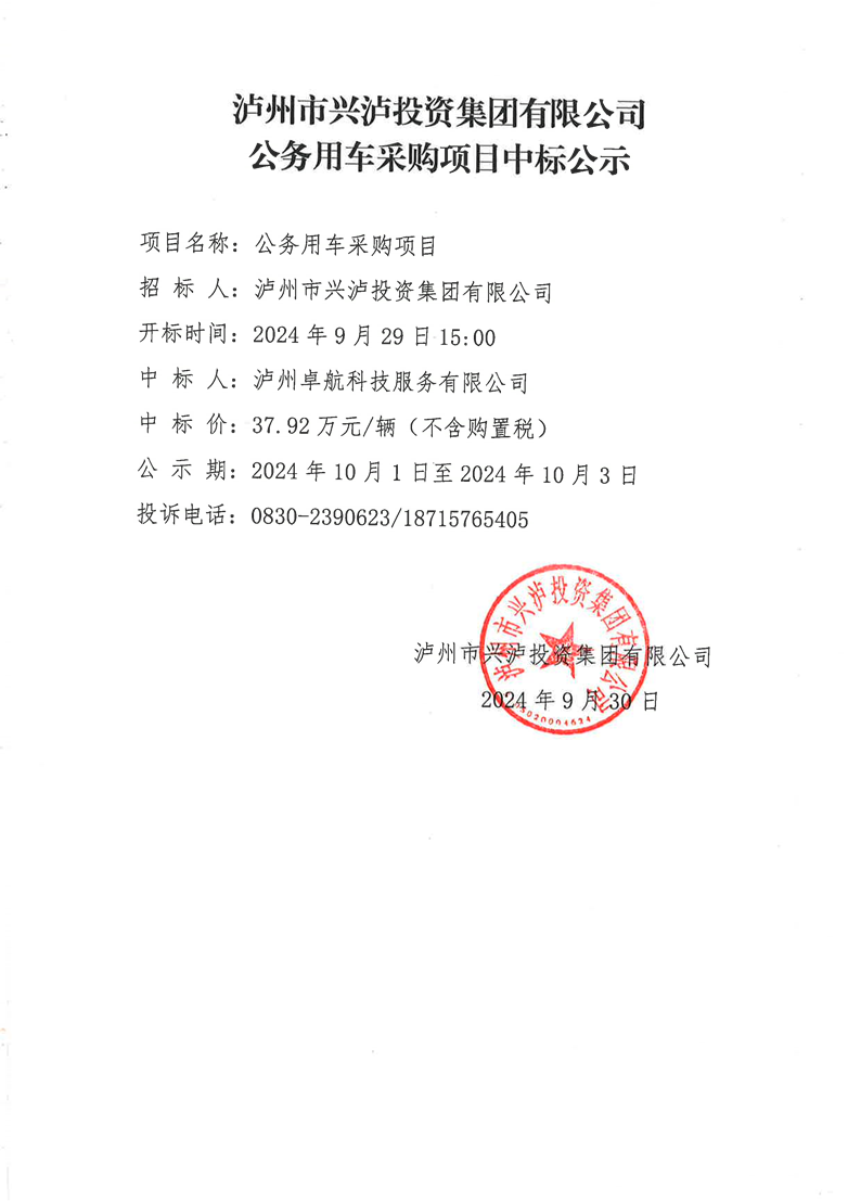 瀘州市興瀘投資集團有限公司公務(wù)用車采購項目中標公示