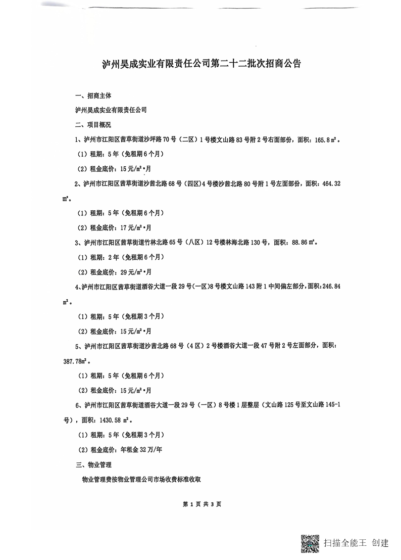 瀘州昊成實業(yè)有限責(zé)任公司第二十二批次招商公告