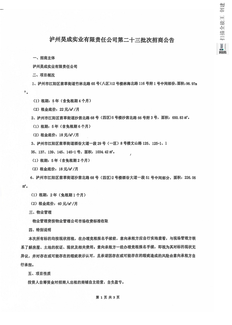瀘州市昊成實(shí)業(yè)有限責(zé)任公司第二十三批次招商公告
