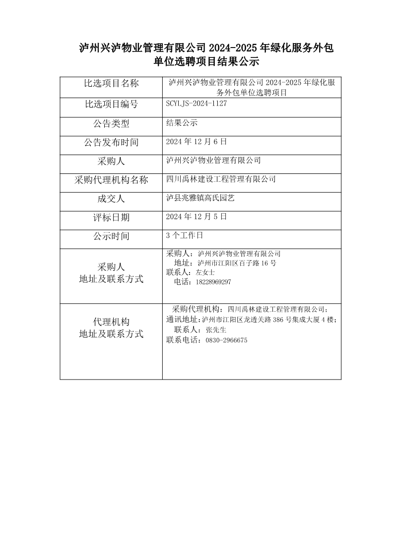 瀘州興瀘物業(yè)管理有限公司2024-2025年綠化服務(wù)外包單位選聘項目結(jié)果公示 作者: 來源: 日期:2024-12-06 瀏覽次數(shù): 次 【字體:小 大】 【打印正文】
