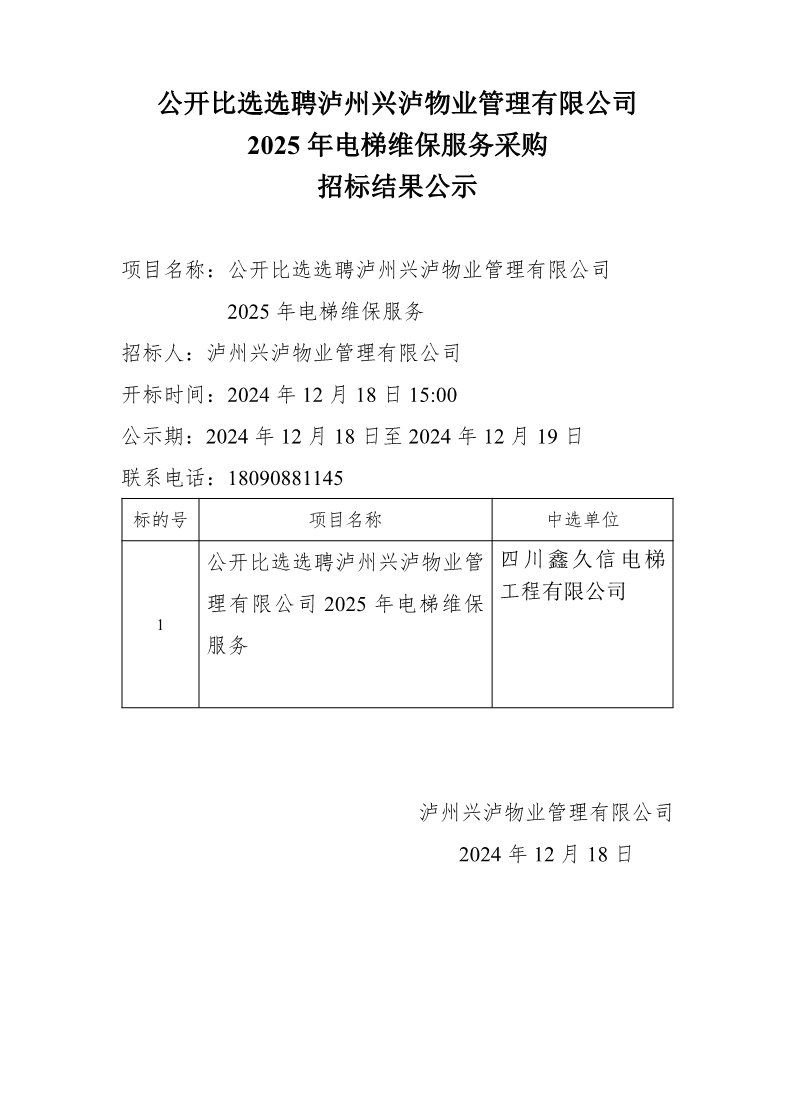 公開比選選聘瀘州興瀘物業(yè)管理有限公司2025年電梯維保服務采購招標結果公示