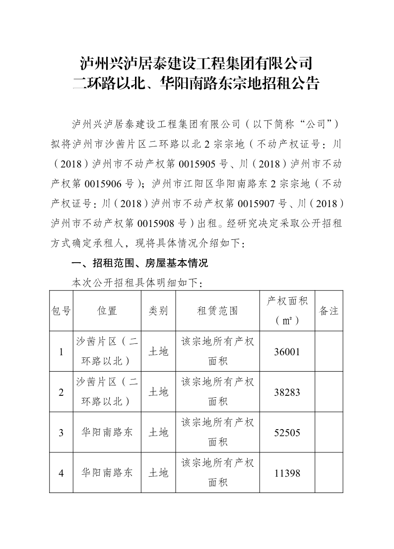 瀘州興瀘居泰建設(shè)工程集團(tuán)有限公司二環(huán)路以北、華陽南路東宗地招租公告 作者: 來源: 日期:2025-02-19 瀏覽次數(shù): 次 【字體:小 大】 【打印正文】
