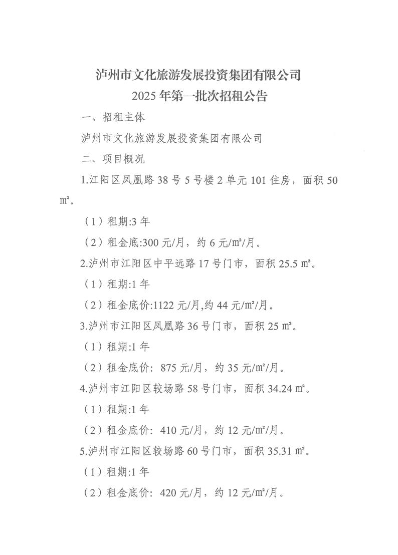 瀘州市文化旅游發(fā)展投資集團有限公司2025年第一批次招租公告