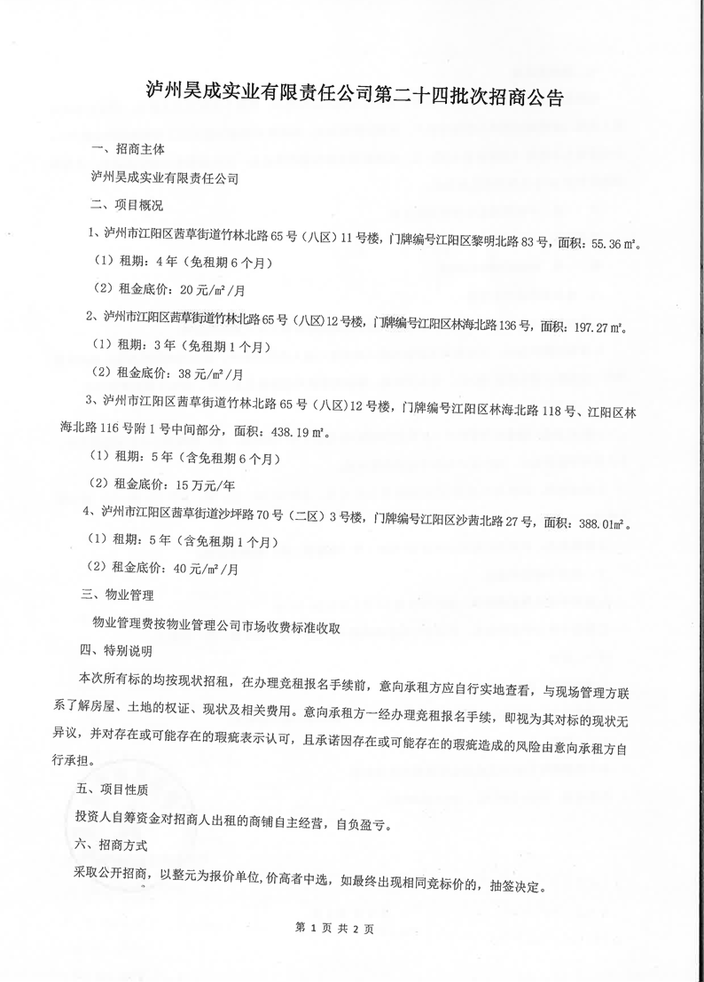 瀘州昊成實(shí)業(yè)有限責(zé)任公司第二十四批次招商公告