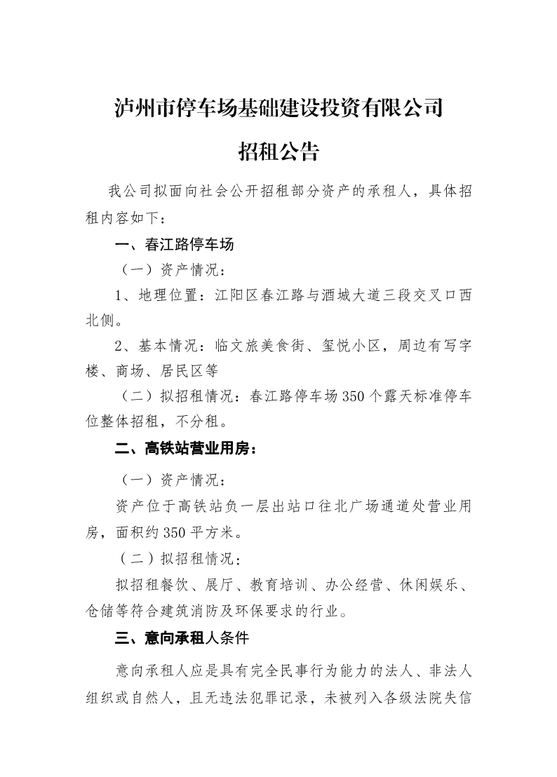 瀘州市停車場(chǎng)基礎(chǔ)建設(shè)投資有限公司招租公告