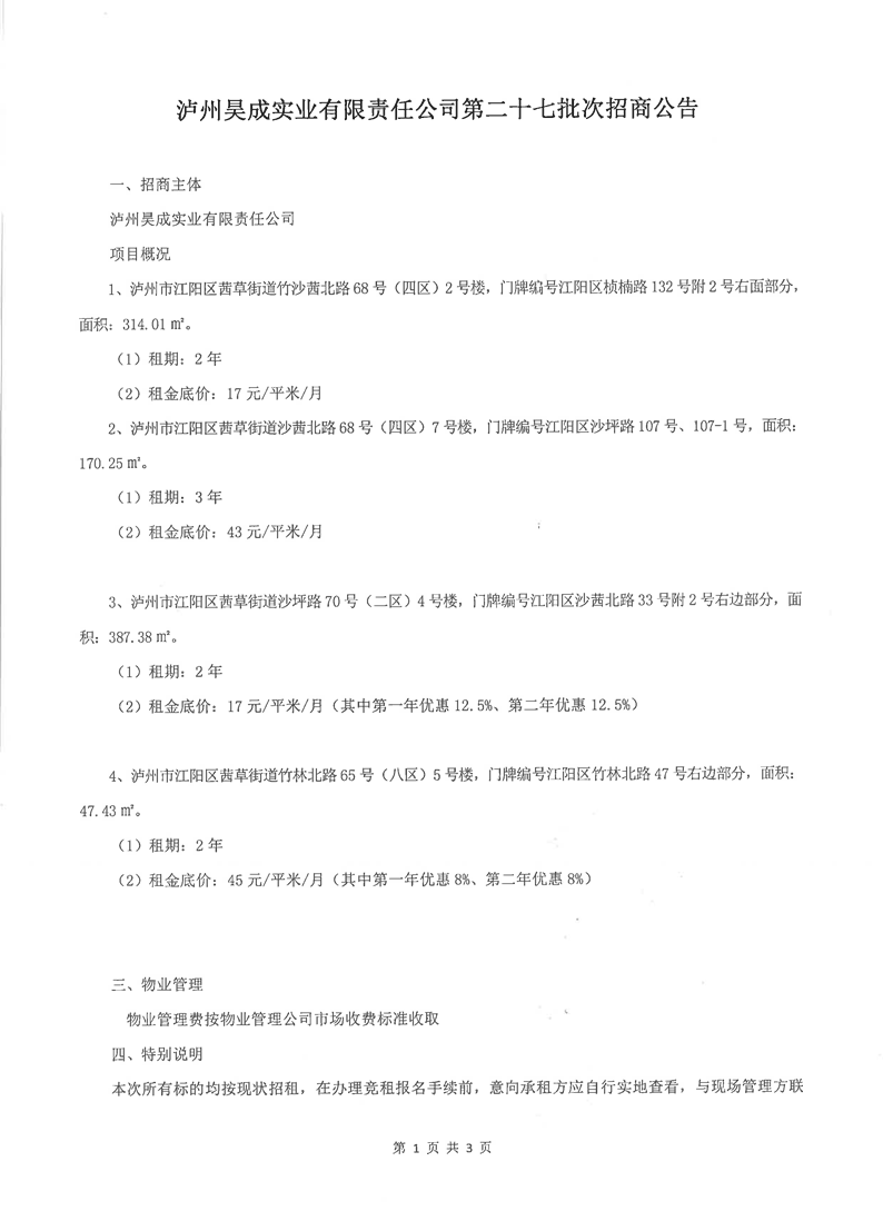 瀘州昊成實(shí)業(yè)有限責(zé)任公司第二十七批次招商公告