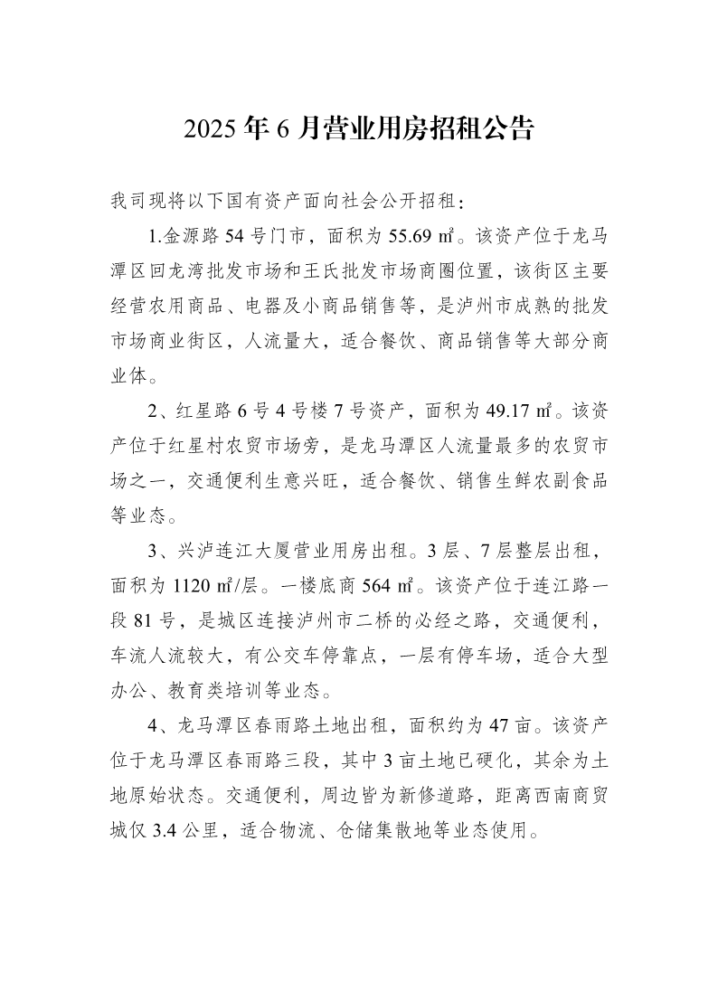 興瀘資產(chǎn)公司2025年6月營(yíng)業(yè)用房招租公告