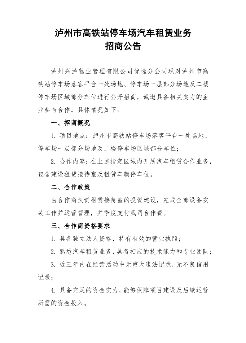 瀘州市高鐵站停車場(chǎng)汽車租賃業(yè)務(wù)招商公告