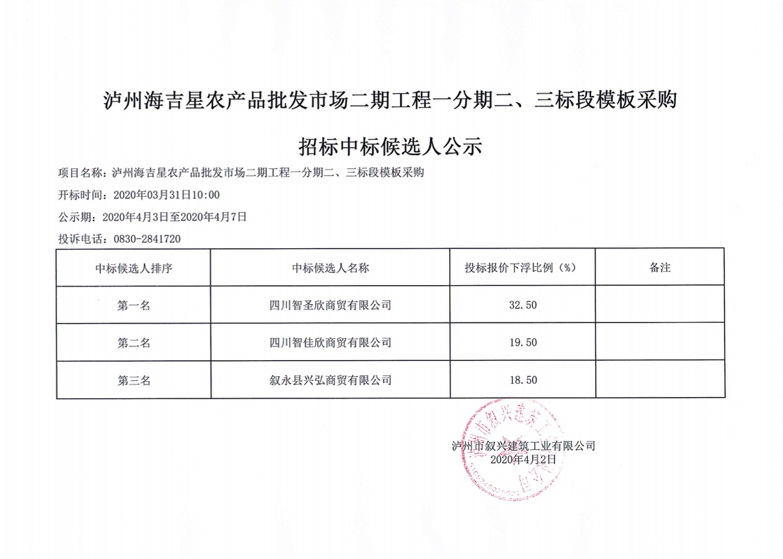 瀘州海吉星農(nóng)產(chǎn)品批發(fā)市場二期工程一分期二、三標段建筑模板采購招標中標候選人公示 作者: 來源: 日期:2020-04-02 瀏覽次數(shù): 次 【字體:小 大】 【打印正文】