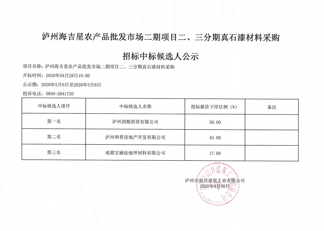瀘州海吉星農(nóng)產(chǎn)品批發(fā)市場二期項(xiàng)目二三分期真石漆材料采購招標(biāo)中標(biāo)候選人公示 作者: 來源: 日期:2020-04-30 瀏覽次數(shù): 次 【字體:小 大】 【打印正文】