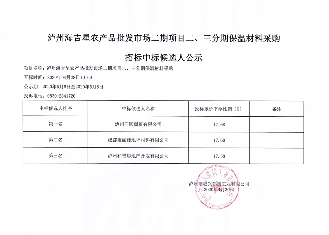 瀘州海吉星農(nóng)產(chǎn)品批發(fā)市場(chǎng)二期項(xiàng)目二三分期保溫材料采購(gòu)招標(biāo)中標(biāo)候選人公示 作者: 來(lái)源: 日期:2020-04-30 瀏覽次數(shù): 次 【字體:小 大】 【打印正文】