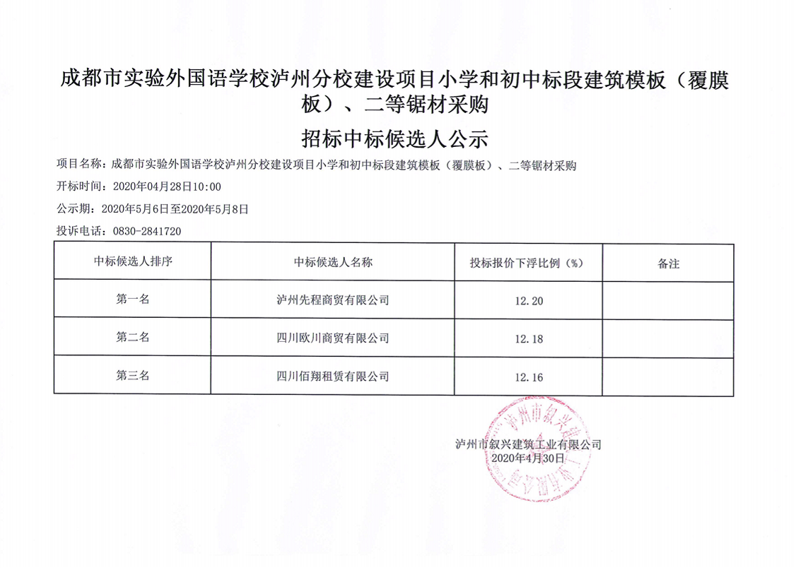 成都市實驗外國語學(xué)校瀘州分校項目小學(xué)和初中標段建筑模板(覆膜板)、二等鋸材采購招標中標候選人公示 作者: 來源: 日期:2020-04-30 瀏覽次數(shù): 次 【字體:小 大】 【打印正文】