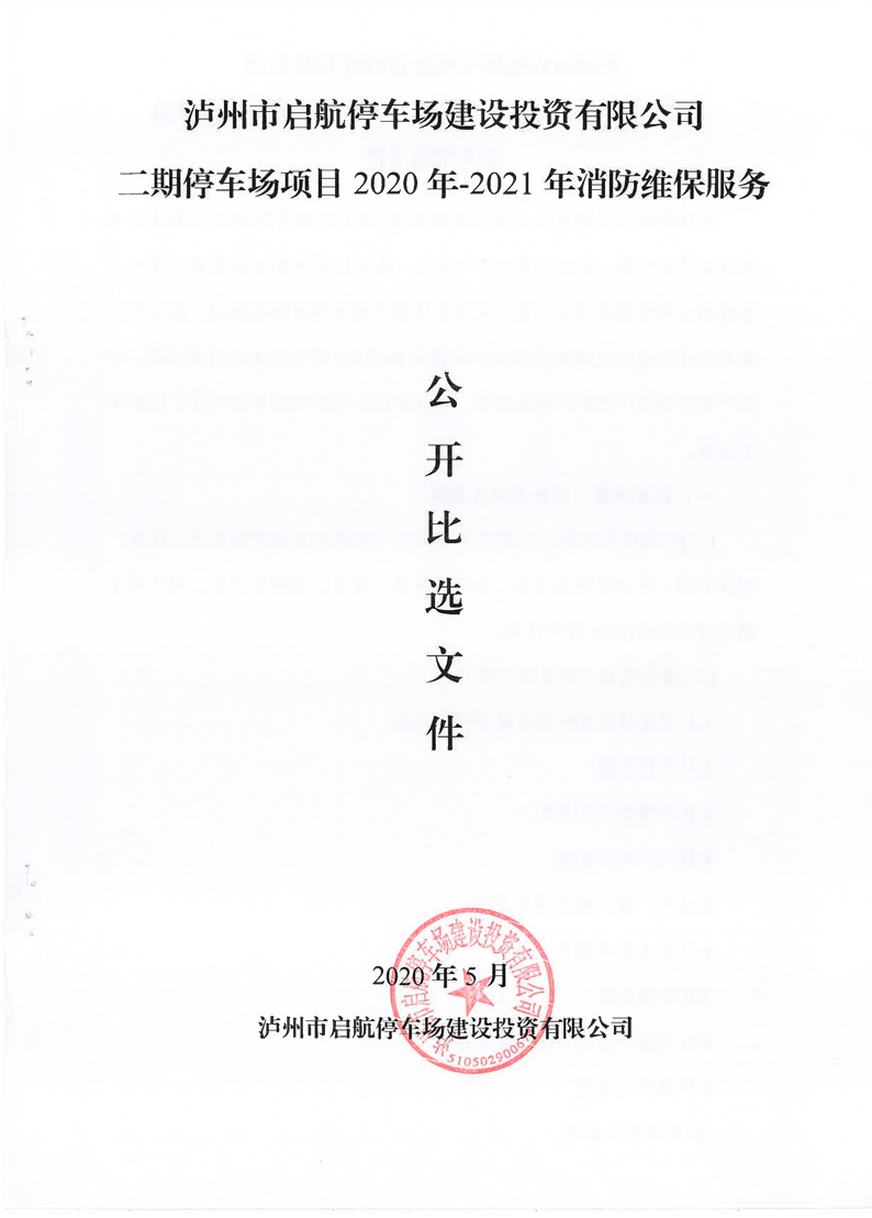 瀘州市啟航停車場建設(shè)投資有限公司二期停車場2020年-2021年消防維保服務(wù)公開比選文件 作者: 來源: 日期:2020-05-14 瀏覽次數(shù): 次 【字體:小 大】 【打印正文】