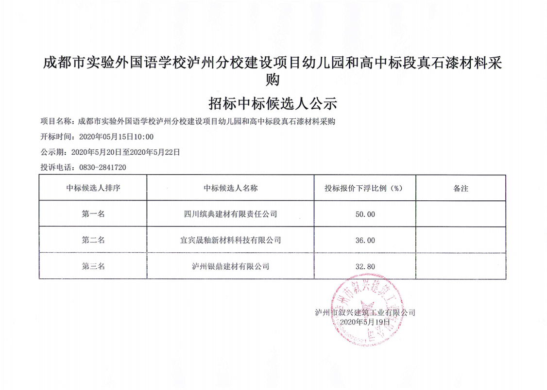成都市實驗外國語學校瀘州分校建設項目幼兒園和高中標段真石漆材料采購招標中標候選人公示