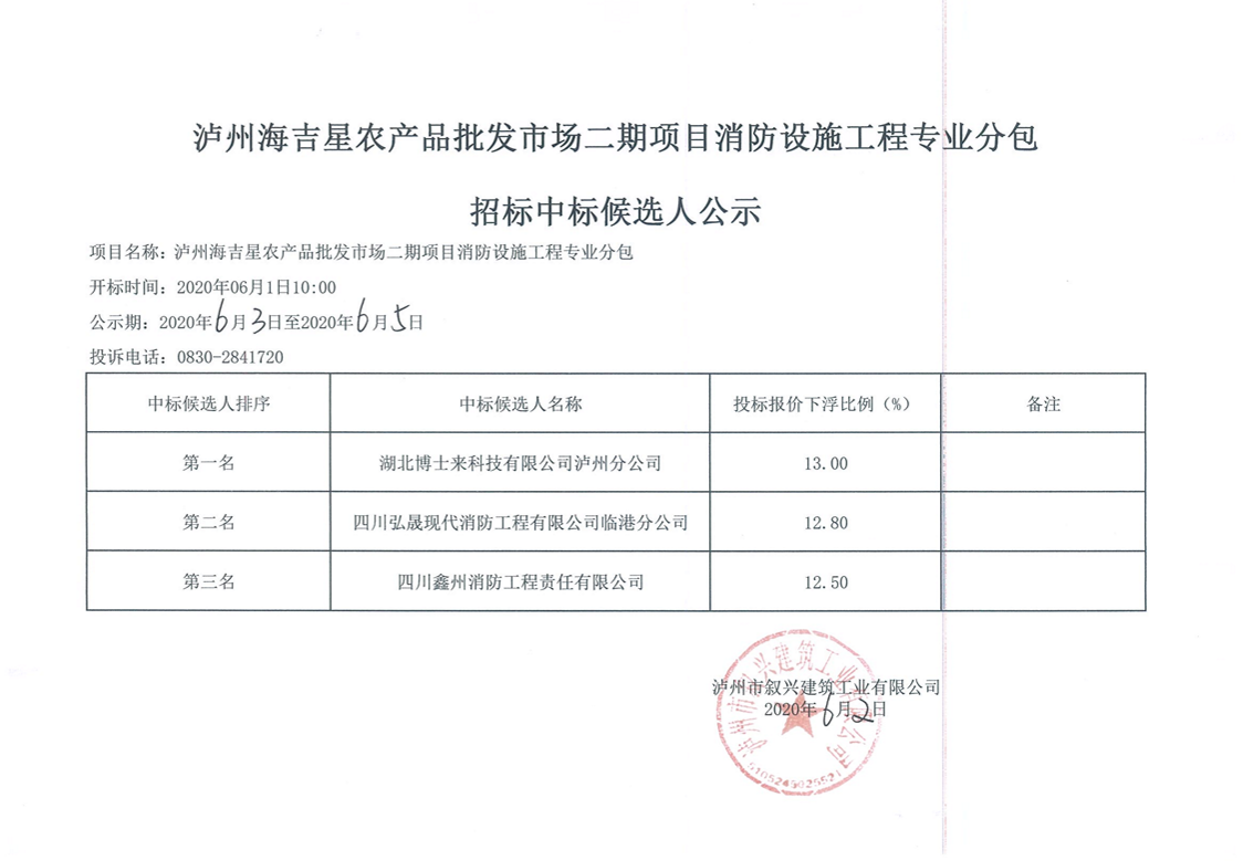 瀘州海吉星農(nóng)產(chǎn)品批發(fā)市場二期項目消防設(shè)施工程專業(yè)分包招標(biāo)中標(biāo)候選人公示 作者: 來源: 日期:2020-06-02 瀏覽次數(shù): 次 【字體:小 大】 【打印正文】