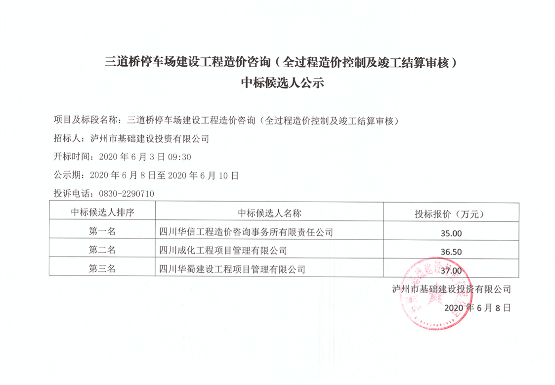 三道橋停車場建設(shè)工程造價咨詢(全過程造價控制及竣工結(jié)算審核)中標(biāo)候選人公示 作者: 來源:工程部 日期:2020-06-08 瀏覽次數(shù): 次 【字體:小 大】 【打印正文】