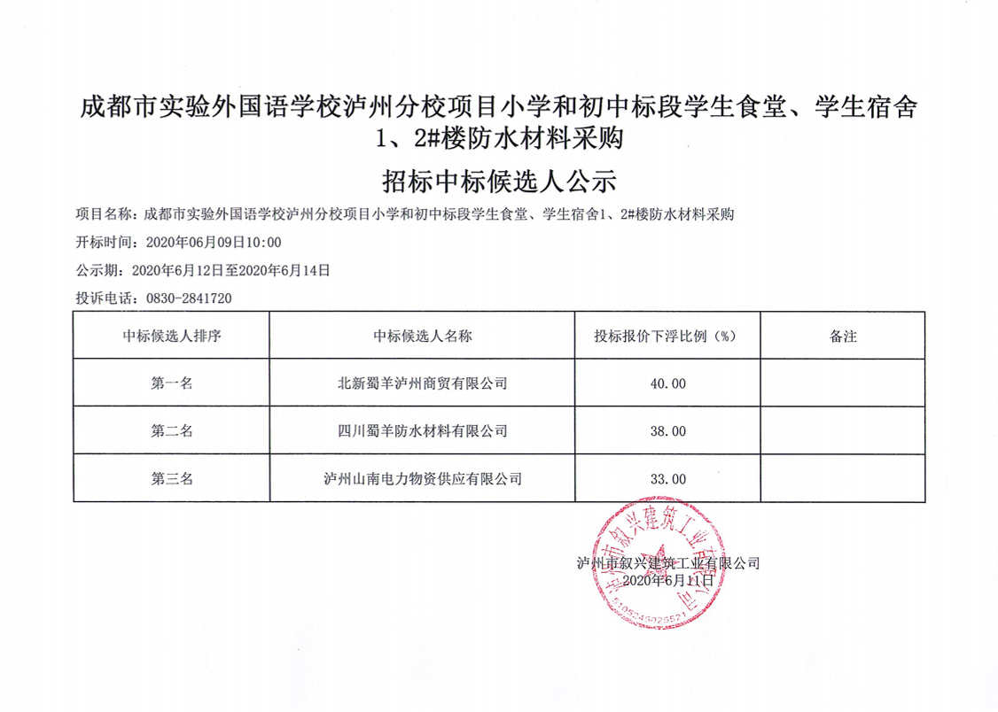 成都市實(shí)驗(yàn)外國(guó)語學(xué)校瀘州分校項(xiàng)目小學(xué)和初中標(biāo)段學(xué)生食堂、學(xué)生宿舍1、2#樓防水材料采購(gòu)中標(biāo)候選人公示 作者: 來源: 日期:2020-06-11 瀏覽次數(shù): 次 【字體:小 大】 【打印正文】