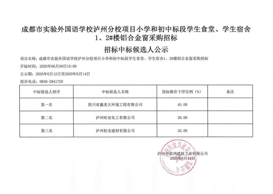 成都市實驗外國語學(xué)校瀘州分校項目小學(xué)和初中標(biāo)段學(xué)生食堂、學(xué)生宿舍1、2#樓鋁合金窗采購招標(biāo)中標(biāo)候選人公示 作者: 來源: 日期:2020-06-11 瀏覽次數(shù): 次 【字體:小 大】 【打印正文】