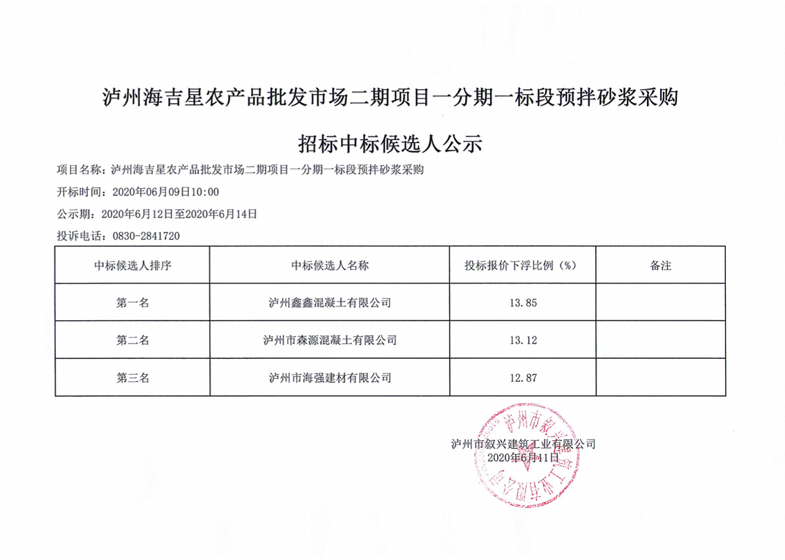 瀘州海吉星農(nóng)產(chǎn)品批發(fā)市場二期項(xiàng)目一分期一標(biāo)段預(yù)拌砂漿采購中標(biāo)候選人公示 作者: 來源: 日期:2020-06-11 瀏覽次數(shù): 次 【字體:小 大】 【打印正文】