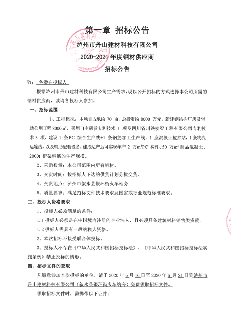 瀘州市丹山建材科技有限公司2020-2021年度鋼材供應(yīng)商招標(biāo)公告 作者: 來(lái)源: 日期:2020-06-15 瀏覽次數(shù): 次 【字體:小 大】 【打印正文】