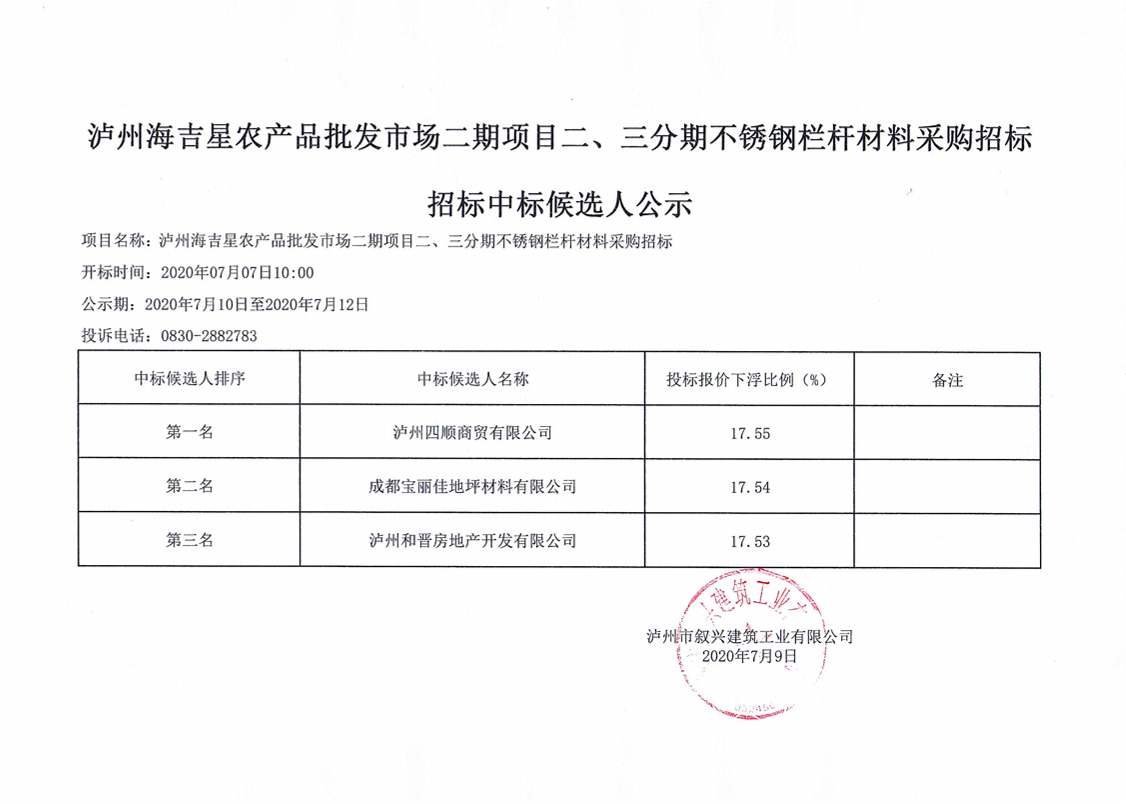 瀘州海吉星農(nóng)產(chǎn)品批發(fā)市場二期項目二、三分期不銹鋼欄桿材料采購招標中標候選人公示 作者: 來源: 日期:2020-07-09 瀏覽次數(shù): 次 【字體:小 大】 【打印正文】