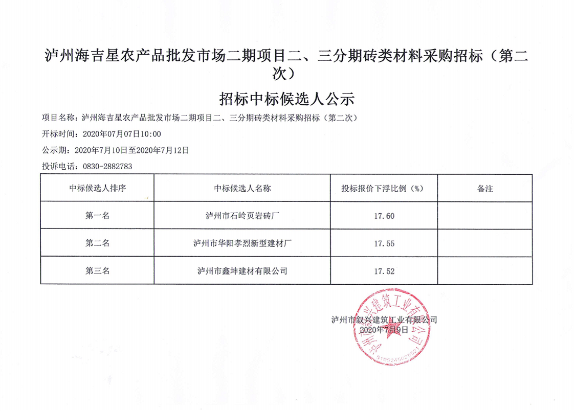 瀘州海吉星農(nóng)產(chǎn)品批發(fā)市場二期項(xiàng)目二、三分期磚類材料采購招標(biāo)(第二次)中標(biāo)候選人公示 作者: 來源: 日期:2020-07-09 瀏覽次數(shù): 次 【字體:小 大】 【打印正文】