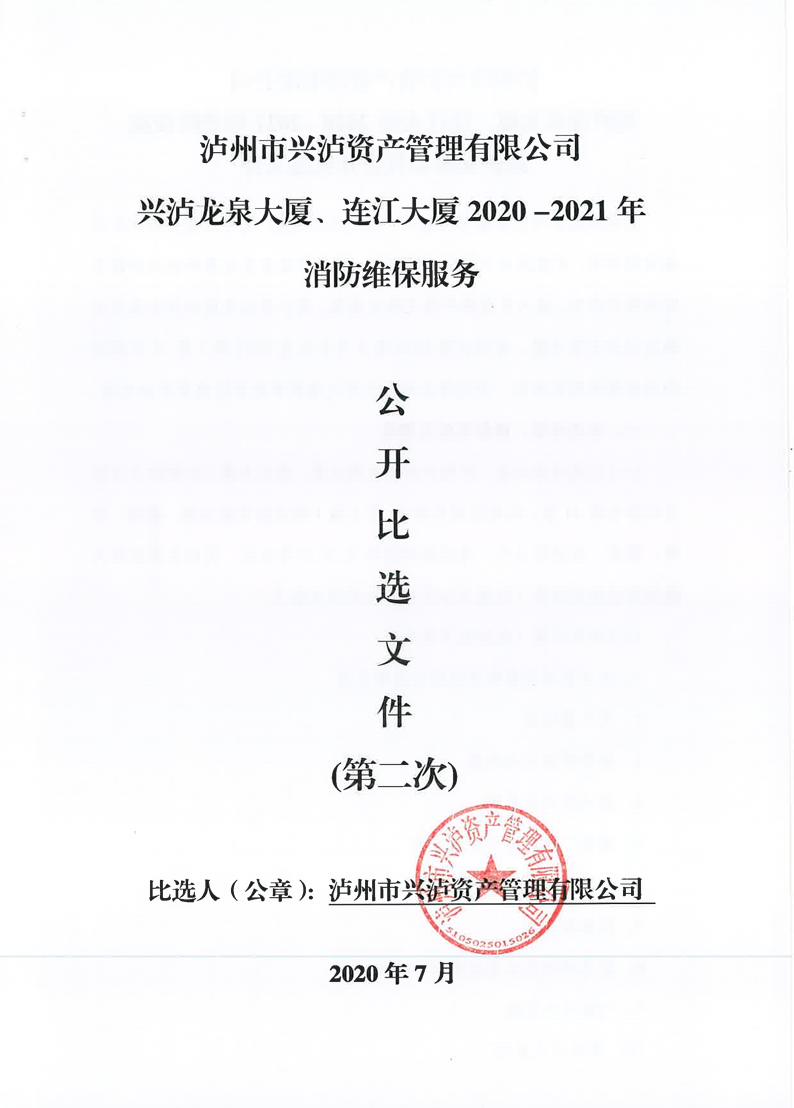 瀘州市興瀘資產(chǎn)管理有限公司興瀘龍泉大廈、連江大廈2020年-2021年消防維保服務(wù)公開比選文件(第二次) 作者: 來源: 日期:2020-07-21 瀏覽次數(shù): 次 【字體:小 大】 【打印正文】