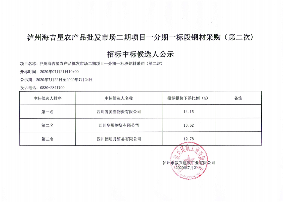 瀘州海吉星農(nóng)產(chǎn)品批發(fā)市場二期項目一分期一標段鋼材采購(第二次)招標中標候選人公示 作者: 來源: 日期:2020-07-21 瀏覽次數(shù): 次 【字體:小 大】 【打印正文】