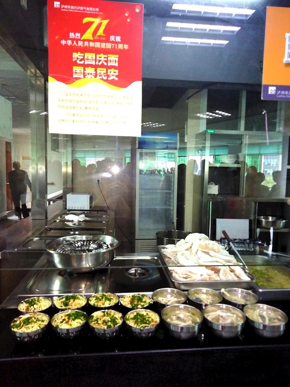 為慶祝中華人民共和國(guó)成立71周年,傳遞新時(shí)代愛國(guó)主義教育精神,9月28日中午,瀘州華潤(rùn)興瀘燃?xì)庥邢薰驹趩T工食堂開展了別開生面的共吃“國(guó)慶面”主題活動(dòng)。
